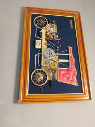 Réplica detallada de un coche Renault de 1913, presentada en un marco. - Diseño intrincado con piezas metálicas y de otros materiales. - Ruedas de radios y detalles mecánicos visibles. - Fondo azul oscuro. - Marco de madera con borde dorado.