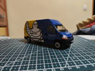 Maqueta detallada de una furgoneta Renault Master con la icónica decoración de Michelin. - Diseño azul y amarillo. - Figura de Bibendum (el muñeco Michelin) en el lateral. - Inscripción Competition en el lateral. - Falta un retrovisor