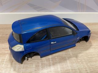 Maqueta de coche de rally Renault Clio S1600. Escala 1/32. - Diseño detallado con patrocinadores. - Puerta del conductor abatible. - Ala trasera característica.