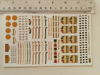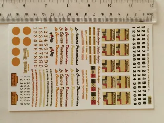 Calcas para maquetas de Scalextric, modelo Panamericana. - Incluye números del 0 al 9. - Diseños variados con banderas y textos. - Calcas para La Carrera Panamericana y Saludos Amigos. - Incluye Aceite Valvoline y Mexico. - 1/32