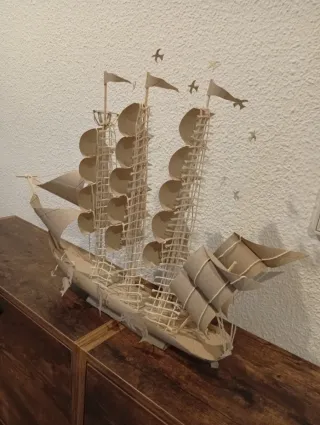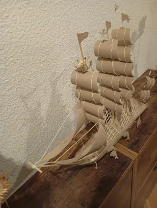 Detallada maqueta de un velero, elaborada de forma artesanal. - Construida con materiales como cartón y cuerda. - Diseño inspirado en barcos de vela antiguos. - Ideal como pieza decorativa.
