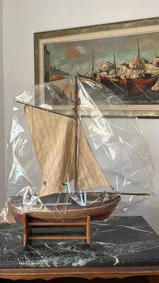 Vendo maqueta grande de un velero que a simple vista no puedo identificar porque no tiene chapa que lo identifique. Estuvo guardado décadas, de ahí su estupendo estado de conservación. Todo de madera. Las velas necesitan algo de limpieza y por lo demás nada que resaltar, no hay piezas rotas ni le falta ninguna. Mide 83 cm de ancho por 67 cm de alto.