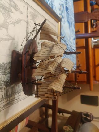 Preciosa maqueta de velero de madera, ideal para decoración. Es un modelo antiguo, con detalles cuidados. - Fabricado en madera. - Velas de tela. - Base de madera .