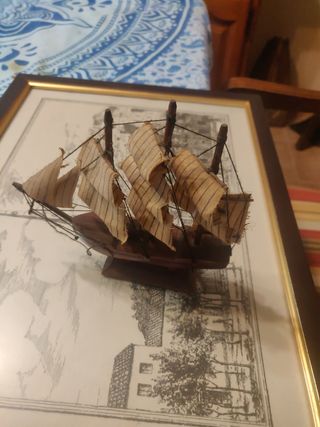 Preciosa maqueta de navío español, de gran tamaño y detallada. Ideal para decoración o coleccionistas. Grandes dimensiones de 73 x 67 cm. Anchura de casco 15 y de velas 25. - Es una pieza única, antigua y con señales del paso del tiempo. - El barco está hecho de madera y tela. - Incluye una base de madera. - NO SE ACEPTAN ENVIOS DEBIDO A SUS DIMENSIONES Y FRAGILIDAD