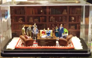 Miniatura o diorama basada en una escena de la serie de la BBC (2015) de la obra Diez negritos de Agatha Christie. Va en vitrina o expositor con tapa metacrilato nueva, tamaño 17x9x9 cm. Escena formada por alfombra hecha a mano en punto de cruz, dos sillones, un sofá, una mesita de centro con periódico, una cajonera, planta con maceta de suelo y los diez personajes de la obra. Personajes de escala 1:50 de maquetas trenes, unos 3,5 cm, realmente pequeños y divertidos. Fondo de papel imitando librería. ¡No encontrarás una igual! SÓLO HAGO ENVÍOS: correos, mensajería o wallapop. No entrego en mano ni en puntos de entrega. Gracia
