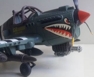 Maqueta de avión de la Segunda Guerra Mundial con un diseño de tiburón. Avión cazabombardero U.S.A. Curtiss P-40 Warhawk g para figuras de tamaño 3'75 - Detalle de pintura de tiburón en la parte frontal. - Colores verde militar y rojo. - Incluye armamento simulado.