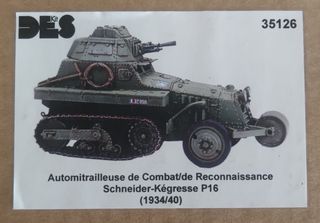 Maqueta de la Automitrailleuse de Combat de Reconnaissance Schneider-Kégresse P16 (1934/40) escala 1/35. Piezas en resina perfectamente moldeadas para reproducir la autoametralladora francesa usada en 1940. Marca DES Kit, referencia 35126.