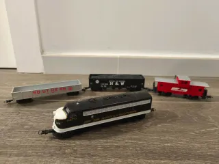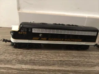 Conjunto de maquetas de tren que incluye una locomotora y varios vagones. - Locomotora Norfolk Southern 4270. - Vagón tolva N&W (Norfolk and Western) con carbón. - Vagón plataforma gris con la inscripción SOUTHERN. - Vagón de cola (caboose) rojo.