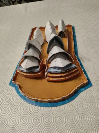 Réplica detallada de la icónica Ópera de Sídney en cartón pluma. Medidas: 34x23x10 cm - Diseño arquitectónico tridimensional. - Base con detalles de agua y terreno.