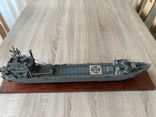 Maqueta detallada de un barco militar, lista para exhibir. - Diseño a escala. - Base de madera incluida.