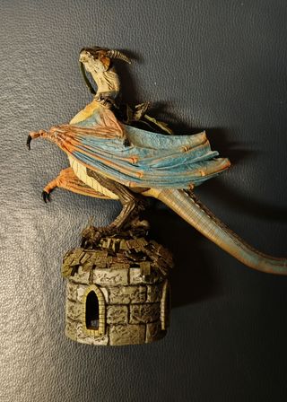 Preciosa maqueta dragón, estilo Señor de los Anillos. Se encuentra en muy buen estado. Unos 20 cm de alto. - Figura detallada y pintada a mano. - Base con diseño de torre. - Ideal para coleccionistas.