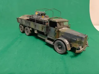 Réplica detallada 1/35 de un camión militar Einheitdiesel alemán de la Segunda Guerra Mundial equipado con un cañón antiaéreo Breda. - Pintura camuflaje desgastada. - Cañón antiaéreo con base giratoria. - Detalles realistas de óxido y uso.