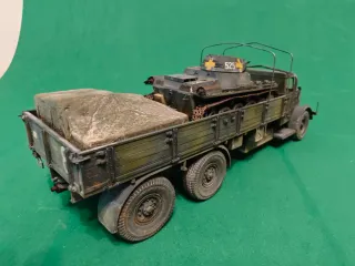 Réplica detallada de un camión Faun L900 militar de la Segunda Guerra Mundial, con un tanque Panzer 1 en su plataforma. - Camión de transporte militar. - Incluye un tanque en la carga. - Detalles de época.
