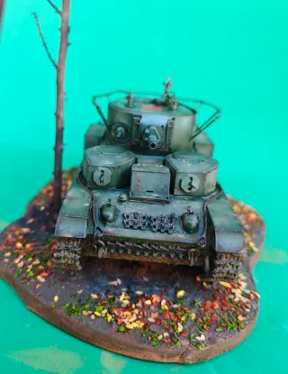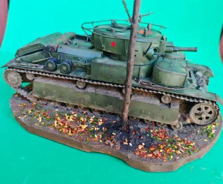 Maqueta de un tanque medio soviético T-28 a escala 1/35. Representa una escena otoñal con detalles. - Escala 1/35. - Modelo de tanque T-28. - Base escénica con temática otoñal.