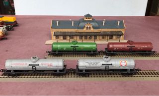 Conjunto de cuatro vagones cisterna de tren en miniatura. - Vagón cisterna verde con inscripción Protrans, S.A.. 20€ - Vagón cisterna granate. 20€ - Vagón cisterna plateado con inscripción LA COMPAÑIA DE ALCOHOLES BILBAO. 20€ - Vagón cisterna plateado con inscripción BODEGAS Y PLANTAS DE EMBOTELLADO EN... y logo SAVIN. 20€ Más cosas de trenes en mi perfil, hago lotes No leer renfe electrotren roco maqueta