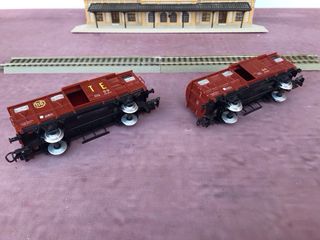 Dos vagones de carbón para maquetas de tren, con la marca Renfe. Electrotren, 1 con garita al otro le falta un tope (no roto) Más cosas de trenes en mi perfil, hago lotes - Color: Rojo oscuro. - Carga: Carbón. No leer roco fleischmann