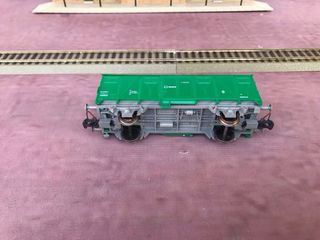 Vagón de mercancías en escala H0 con toldo y carga. Electrotren, renfe, borde bajo - Modelo: Toldos Roldán - Escala: H0 - Carga cubierta con lona verde y sujeciones. Más cosas de trenes en mi perfil No leer roco, maqueta
