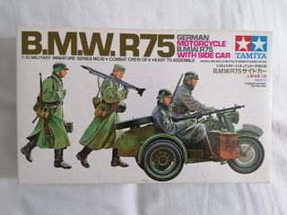 Maqueta a escala 1/35 de la motocicleta alemana BMW R75 con sidecar de Tamiya. Incluye figuras de combate. - Serie: 1/35 Military Miniature Series No.16. - Modelo: BMW R75 con sidecar. - Incluye 4 figuras. - Fácil de montar. Hago envíos por correos o entrega en mano.