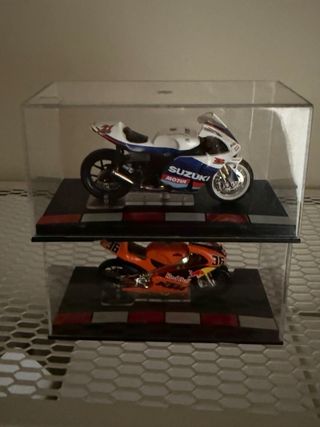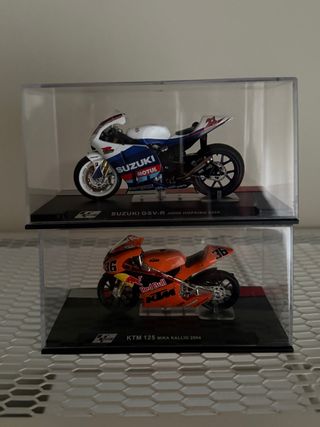Dos maquetas de motocicletas de competición a escala 1/24 - Maqueta Suzuki GSV-R John Hopkins 2005. - Maqueta KTM 125 Mika Kallio 2004. - Medidas... 85mm ancho x 45 mm alto • “Siempre en vitrina, sin exposición al sol” • “Urna y peana originales, estado de colección” • “Descatalogadas”
