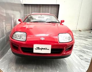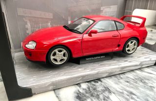 Maqueta de Toyota Supra mk4 escala 1:18 (23 cms). Abre puertas y tiene dirección. Nuevo en cajas originales sin exponer. Se Realiza Envio bien protegido. No cambios no negociable. Opcion de personalizar las matrículas. Posible Entrega en mano en León y Madrid. - Color rojo vibrante. - Réplica a escala 1:18.