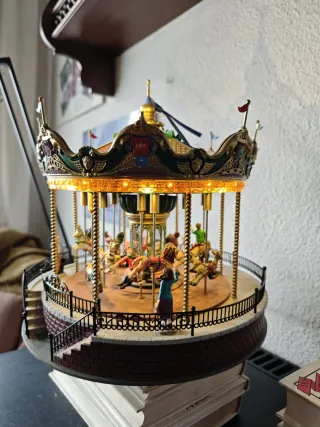 Preciosa maqueta de un tiovivo musical con luces. - Detallado diseño con figuras y adornos. - Corona decorada con luces LED. - Base con barandilla y escaleras.