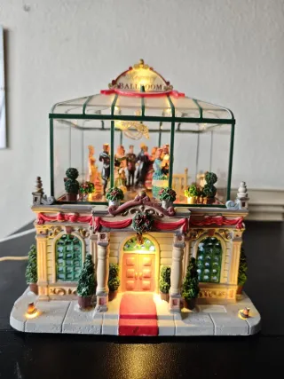 Maqueta detallada de un salón de baile estilo Regency, con figuras y luces. - Diseño arquitectónico clásico. - Figuras de personas bailando en el interior. - Iluminación cálida que realza los detalles. - Techo acristalado. - Decoración festiva.