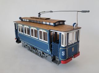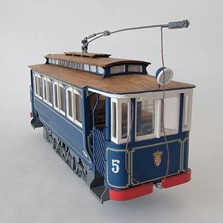 Maqueta ya construida del Tranvía Azul de Barcelona, modelo Occre 53001. - Longitud: 415 mm - Calibre G-45 (45 mm) - Escala 1: 24 - Réplica detallada del histórico tranvía. - Color azul con detalles en madera y dorado. - Incluye pantógrafo y número 5 visible. Edición agotada, solo para coleccionistas. Las fotos son parte de la descripción.