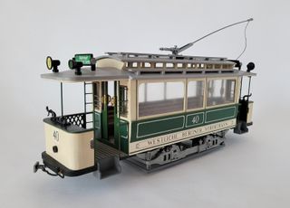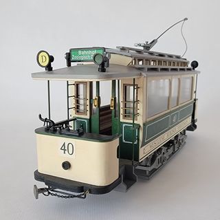 Maqueta ya construida de tranvía de Berlín, Occre 53004. - Longitud: 390 mm - Calibre G-45 (45 mm) - Escala 1: 24 - Réplica detallada del histórico tranvía de la línea WESTLICHE BERLINER VORORTBAHN. - Número de unidad 40 visible en ambos extremos. - Incluye pantógrafo y señalización. Edición agotada, solo para coleccionistas. Las fotos son parte de la descripción.