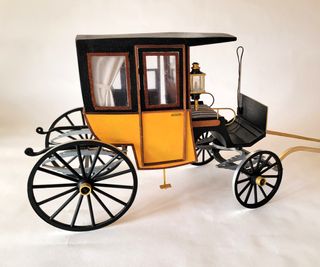 Maqueta ya construida de un carruaje taxi de Barcelona, modelo Occre 51002. - Diseño clásico y elegante. - Tonos negros y ocres. - Ruedas de gran tamaño con radios. Las fotos son parte de la descripción.