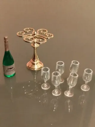 Set de accesorios en miniatura para casa de muñecas, maqueta, coleccionismo compuesto por: - Soporte de metal dorado para copas ( Alto 3,5 x Largo 3,3 cms) - 6 copas de plástico ( Alto 2 cms /lo Largo 0,8 cms) - 1 Botella en plástico ( Alto 3,7 cms)