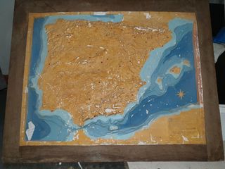 Maqueta cuadro en relieve de escayola península ibérica de 1950,con marco de roble en perfectas condiciones.gran nivel de detalle Requiere pequeña restauración de hay su precio.restauradores profesionales, pieza muy escasa muy decorativa y coleccionable coleccionistas,museos ,exposiciones,anticuarios,geografía española y Portugal