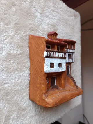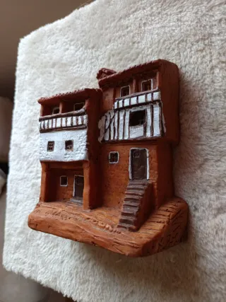 Pequeña maqueta de una casa típica de La Alberca, Salamanca. Ideal como recuerdo o pieza decorativa. De barro, hecha a mano - Diseño detallado de arquitectura tradicional. - Colores terrosos y detalles en blanco y marrón.