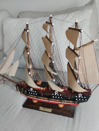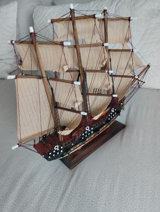 Preciosa maqueta de barco de madera, estilo bergantín del siglo XVIII. Se encuentra en perfecto estado. - Escala detallada. - Fabricado en madera. - Diseño elegante y cuidado. - Solo entrega en mano Pontevedra y alrededores.