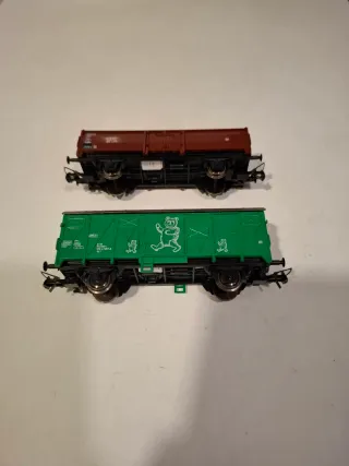 Conjunto de dos vagones de mercancías en escala H0 1:87 SIN CAJA. Marca Roco. - Vagón bordes bajos marrón matrícula 01805041213-1. - Vagón cerrado verde matrícula 01001234567-3. Vagón tren mercancía maqueta.