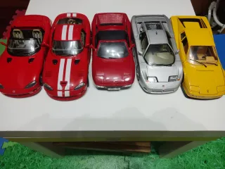 Conjunto de cinco maquetas de coches deportivos.Escala 1/18 -Bugatti EB110 gris (Burago) - Ferrari Testarrossa amarillo(Burago) - Dodge Viper RT10 rojo(Burago) - Dodge Viper GTS rojo(Burago).Roce en la parte trasera (última foto) - Ferrari 348 TS rojo(Burago) Preferiblemente se vende el lote completo.Por separado precio a convenir.Sin caja ni peana