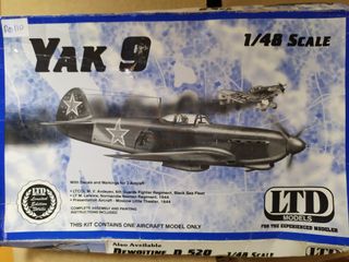 Maqueta del caza soviético Yak-9 de la marca norteamericana LTD, a escala 1/48. Kit completo con todas las piezas; caja algo deteriorada; el papel soporte de las calcas ha amarilleado, pero son utilizables (VER FOTOS). NO SE ADMITEN OFERTAS.