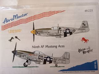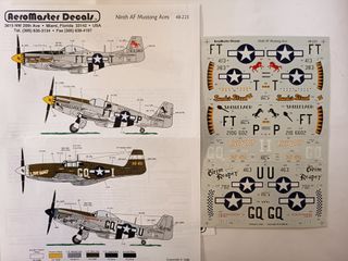 Hoja de calcas 48-225 de la marca Aeromaster para maquetas a escala 1 /48 del caza norteamericano P-51 B/D Mustang. Sin usar.