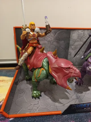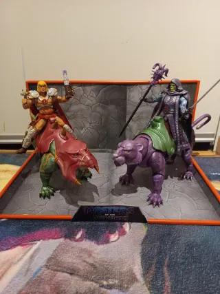 ESCUCHO OFERTAS....Maqueta personalizada de Masters of the Universe. HE MAN Y SKELETOR BATTLE CAT Y PHANTOR, Esta fija para exposición pero se pueden quitar y poner en otra base sin problema, cualquier duda consulta son compromiso. Son todo piezas originales de masters of the universe - Incluye figuras de He-Man y Skeletor. - Montados en Battle Cat y Panthor. - Base con diseño de Masters of the Universe.