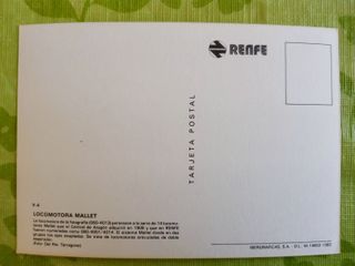 Postal editada por Renfe de la locomotora Mallet. 10x15 cm. tren trenes train railway sncf comboio adif ave feve ferrocarril estación atocha chamartin sants gare db hbf máquina vapor maqueta ibertren roco brawa marklin fleischmann vías maquetren electrotren humbrol rivarossi catenaria trix liliput caf bombardier alstom talgo cercanías siemens ansaldo fiat aeg stadler hitachi