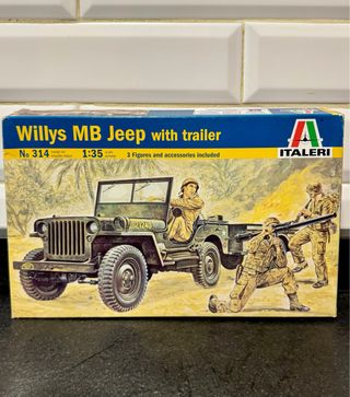 Maqueta a escala 1:35 del Willys MB Jeep con remolque de Italeri. Nunca se ha intentado montar, incluye todas las piezas, cualquier duda consultad. Gracias!! - Modelo: Willys MB Jeep con remolque - Escala: 1:35 - Fabricante: Italeri - Referencia: No 314
