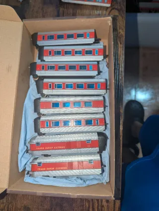 Lote de Ibertren Talgo 3, "Trans Europ Express" -Escala H0 -Tren fabricado por Ibertren -Sin cajas originales, solo una del coche comedor -Todos los coches tienen luces funcionales, tanto de interior como las rojas de cola y en los furgones -8 Coches 1 clase, 2 coches furgones de cola, 2 coches cafetería -Rueda perfecto, como nuevo. -Su uso fue de una maqueta en verano, desde entonces ha estado en su caja.