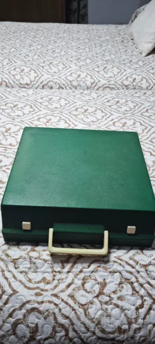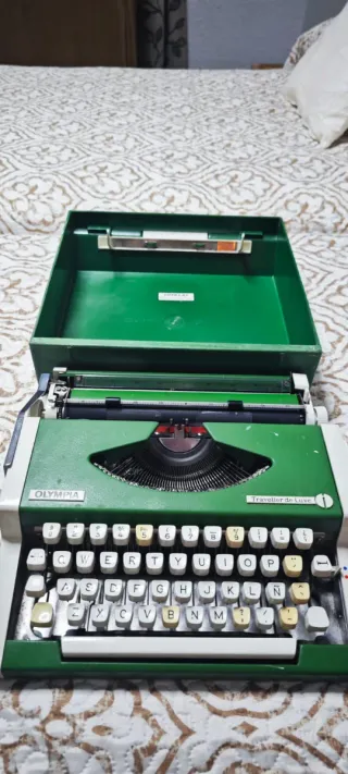 Máquina de escribir Olympia de estilo vintage, ideal para coleccionistas o como pieza decorativa. - Diseño clásico. - Color verde oscuro. - Incluye su maletín de transporte.