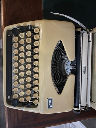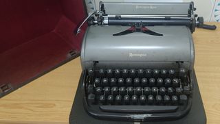 Máquina de escribir antigua en funcionamiento con su estuche.