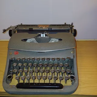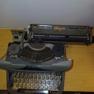 Máquina de escribir antigua de la marca Regia. Un objeto clásico con un diseño retro. Regalo un rollo de cinta de color rojo y negro. - Teclado QWERTY. - Carcasa de metal. - Detalles en color rojo.