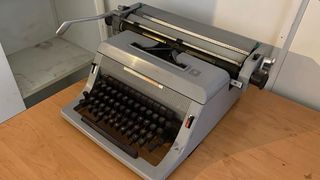 Máquina de escribir antigua con un diseño clásico. - Carcasa de color beige. - Detalles en gris oscuro en las esquinas.