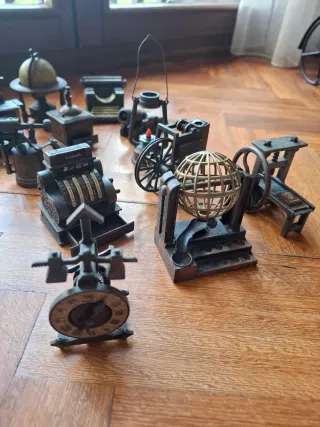 Conjunto de sacapuntas en miniatura, ideales para coleccionistas. - Diseño detallado de objetos antiguos. - Fabricados en metal con acabado envejecido. - Incluye réplicas de máquinas de escribir, calculadoras y globos terráqueos.