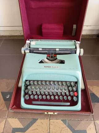 Vendo máquina de escribir Olivetti clásica en buen estado y funcionando perfectamente. 🟢 Teclado completo 🟢 Mecánica en buen funcionamiento 🟢 Incluye maletín original para transportarla 🟢 Color verde vintage muy bonito Ideal para coleccionistas, decoración retro o amantes de la escritura clásica. Tiene algunas marcas normales del paso del tiempo, pero está bien conservada. 📍 Entrega en mano o envío por Wallapop. - Color verde azulado. - Teclado QWERTY completo. - Maletín original