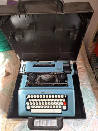 Máquina de escribir Olivetti de color azul, con su maletín de transporte. - Diseño clásico y funcional. - Incluye maletín rígido para guardarla y transportarla.