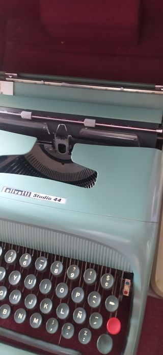 Máquina de escribir Olivetti Studio 44 en buen estado. Un clásico para coleccionistas o para quienes disfrutan de la escritura tradicional. - Color verde menta. - Incluye su maletín original de color rojo.