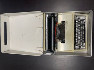 Máquina de escribir portátil Olivetti Dora, un clásico para coleccionistas o para quienes disfrutan de la escritura tradicional. - Diseño compacto y funcional. - Teclado QWERTY. - Incluye su maletín de transporte.
